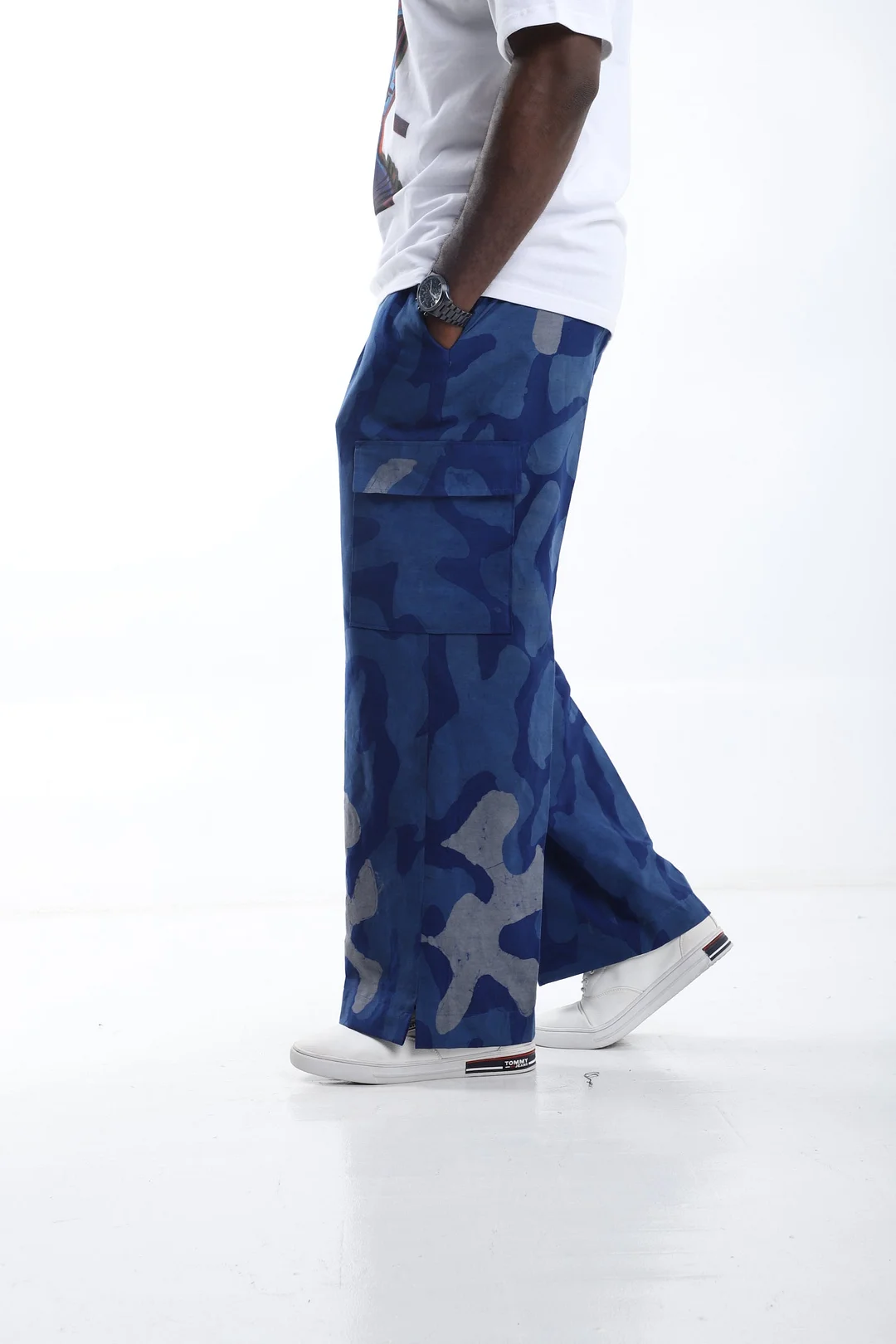 Blue Camouflage Cargo Pants with White T-Shirt