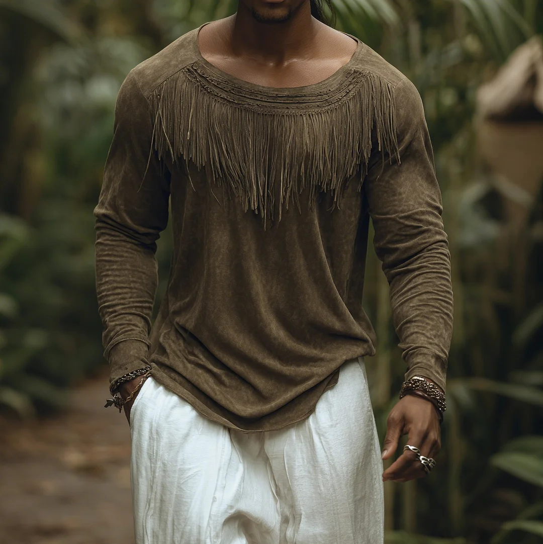 Men's Loose-fitting Pure Cotton Low-cut Long-sleeved T-shirt Jungle Holiday Casual Top With Tassel Decoration-inspireuse
