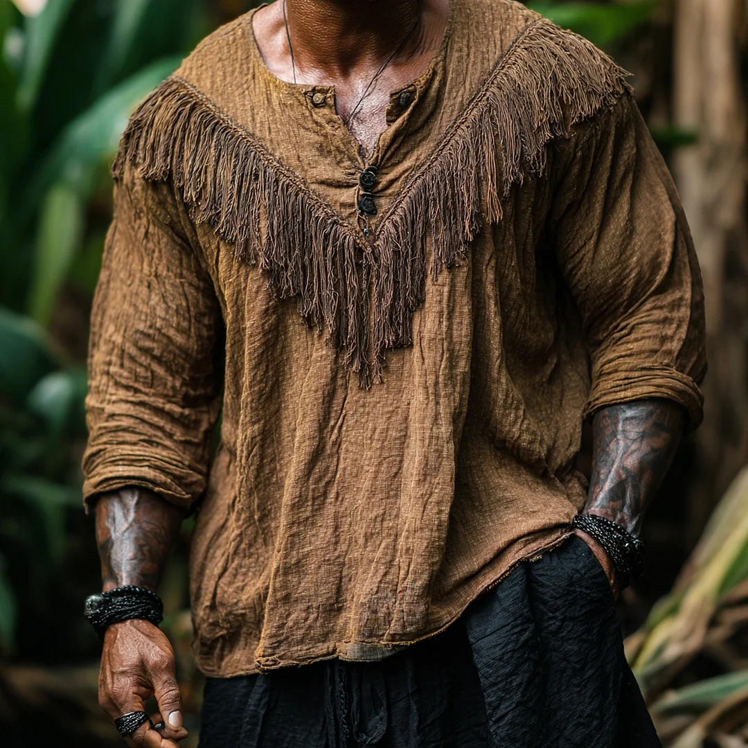 Men's Loose Linen Henley Collar Long Sleeve T-Shirt, Comfortable And Breathable Cotton Linen Top With Tassel Decoration-inspireuse