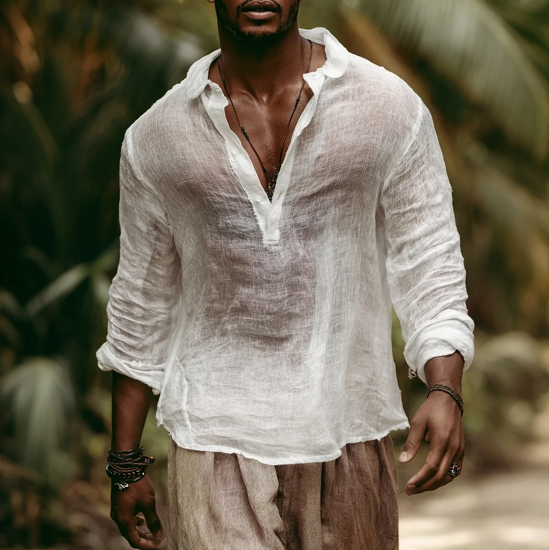 Men's Loose Linen V-Neck Long-Sleeve T-Shirt Jungle Holiday Casual Shirt Collared Top-inspireuse