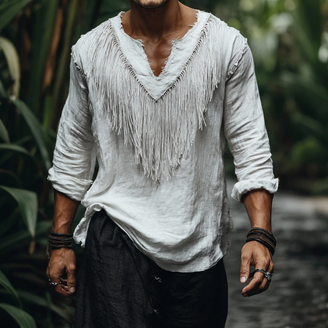 Men's Loose Linen V-Neck Long-Sleeve T-Shirt Jungle Holiday Casual Tassel Top-inspireuse