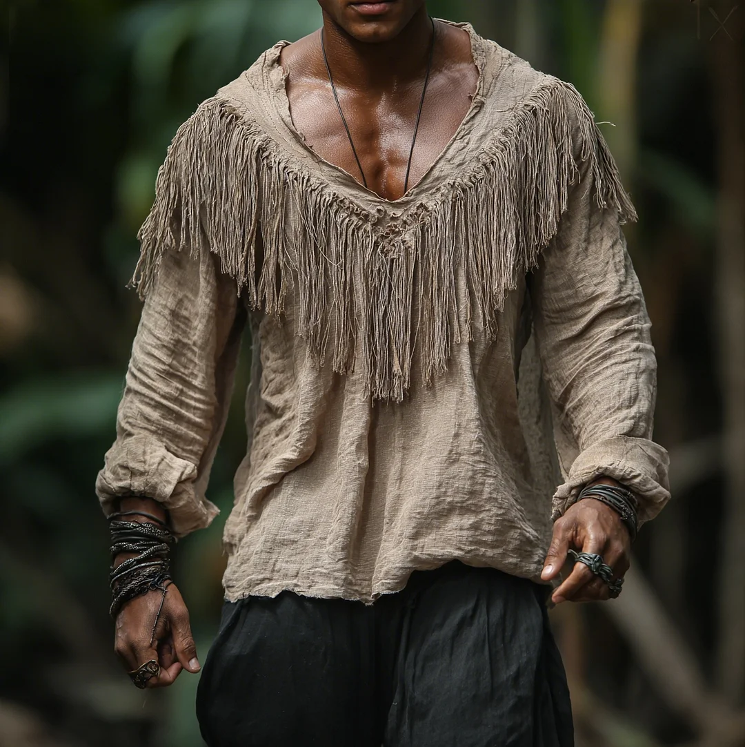 Men's Retro Linen Tassel-Decorated V-Neck Long-Sleeve T-Shirt Jungle Holiday Casual Tribal Ethnic Style Top-inspireuse