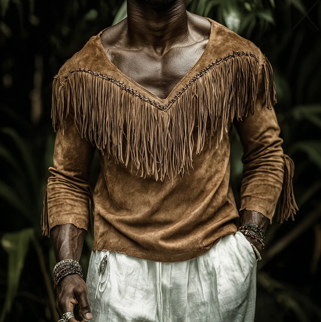 Men's Retro Suede Tassel-Decorated Long-Sleeved T-Shirt, Jungle Holiday Casual Tribal Ethnic Style Top-inspireuse