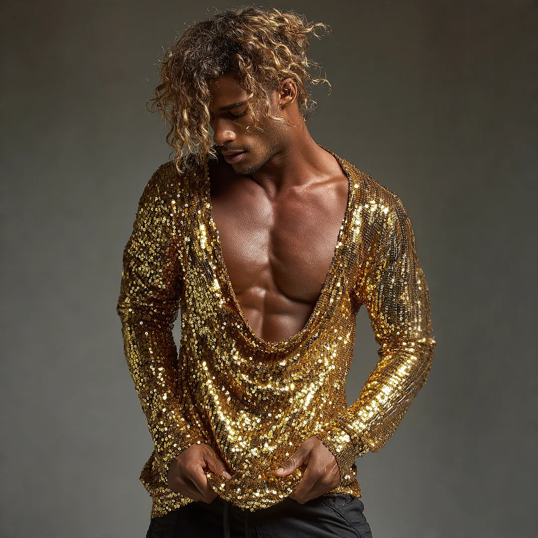 Men's Sequined Long-sleeved T-shirt With Subtle Shimmer, Sexy Low-cut Top-inspireuse
