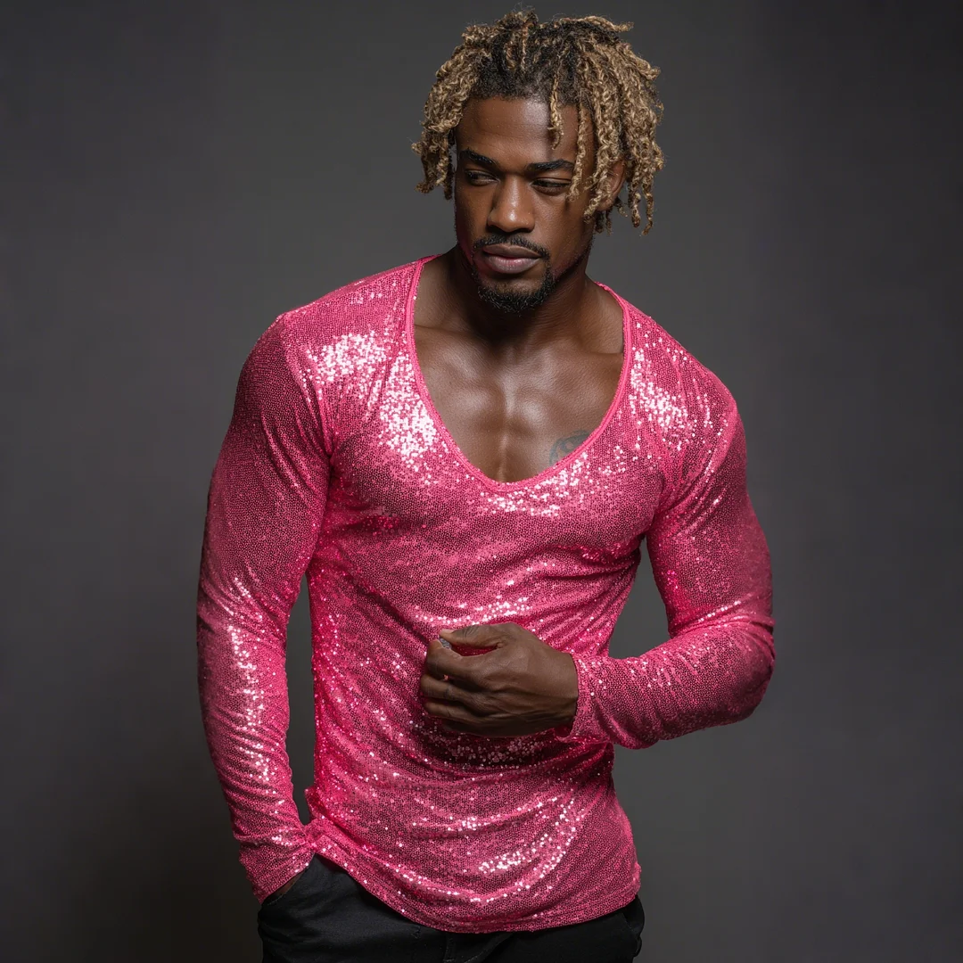 Men's Sequined Long-sleeved T-shirt With Subtle Shimmer, Sexy Low-cut Top