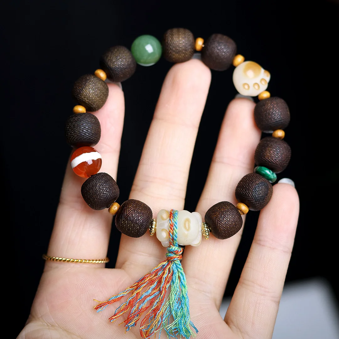 - Details: Intricate Textured Wood Beads, Smooth Bone Charms, Vibrant Colored Tassels, and Gold Accents