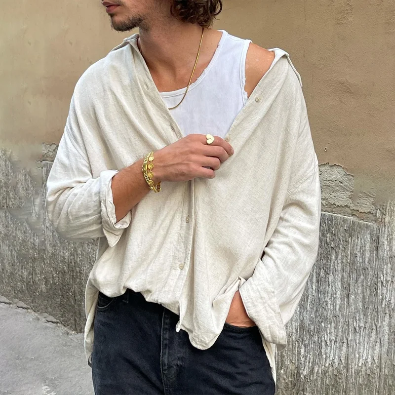 Mens Pure Cotton Solid Color Loose Shirt